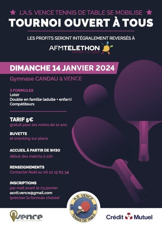Le dimanche 14 janvier 2024 à 9h30, salle Candau de Vence, aura lieu le Téléthon de l'AS Vence Tennis de Table.