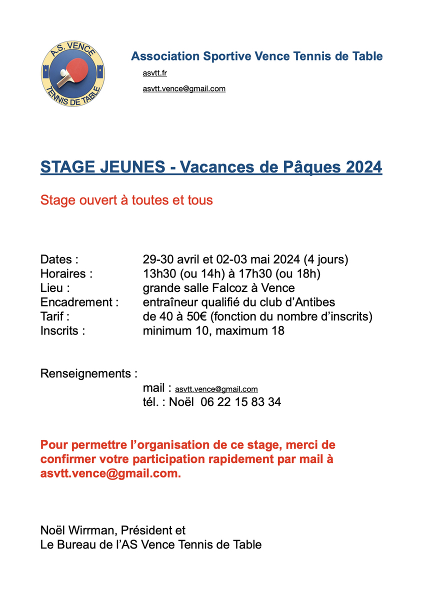 Pour permettre l’organisation de ce stage, merci de confirmer votre participation rapidement par mail à asvtt.vence@gmail.com.