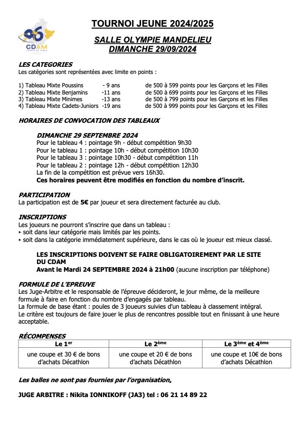 Nécessité d'avoir la licence compétition ; la participation de 5 € par joueur est offerte par le Club