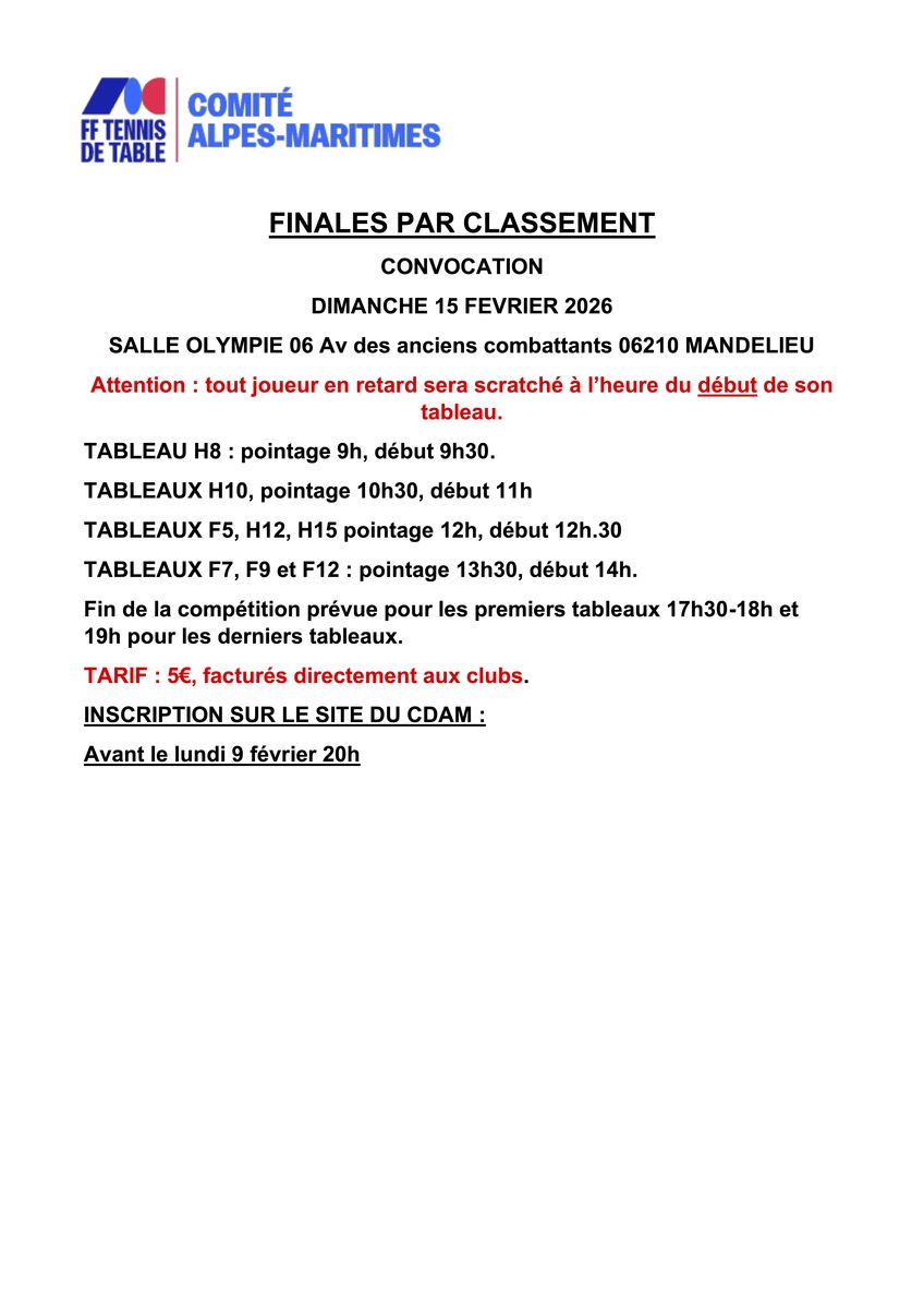 Attention : tout joueur en retard sera scratché à l’heure du début de son tableau.